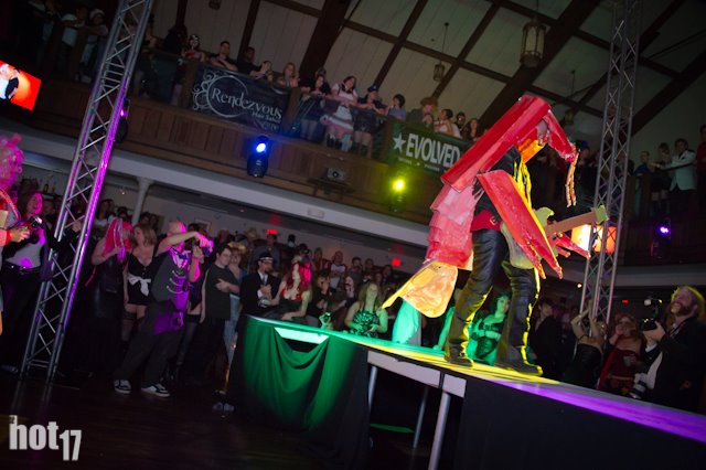 Secondly, … ya, okay, it’s a fetish party. It’s not all chains and whips, however they are present – it’s not celebrating disturbing fetishes (like people who really like feet), but the more presentational and even artistic expressions, such as Burlesque, body modification, and even one of the most wide-spread fetishes of all – dancing. As a final note, if you are one to be a bit squeamish at times, or prude about partial nudity, than perhaps Trauma isn’t for you. Nudity is an abundant resource at Trauma – from pre-painted-on costumes, to bodies being painted, to performers striping down to pasties and panties – the nakedness at Trauma makes the nakedness at Comfest seem almost non-existent.